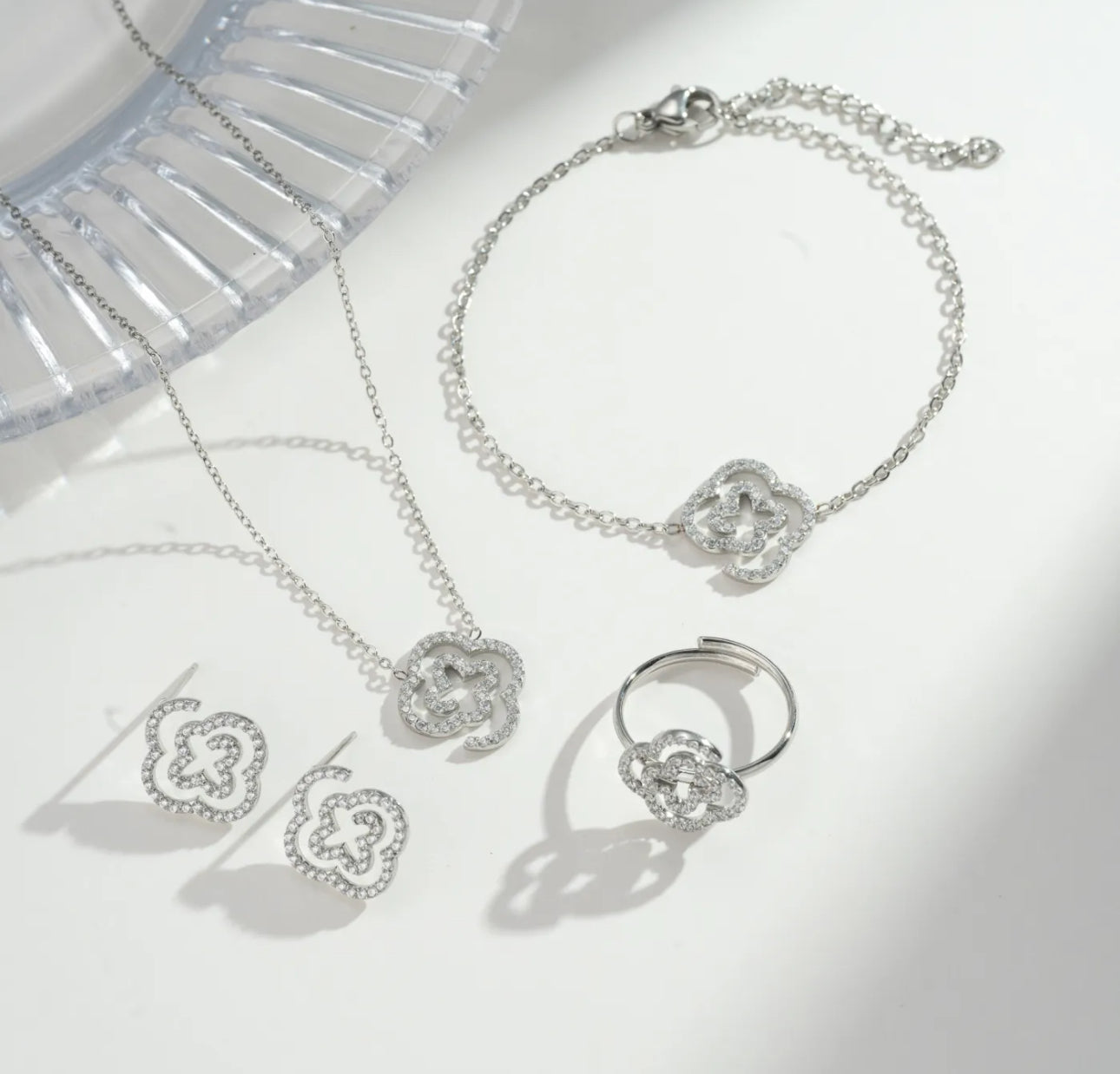 Découvrez ces boucles d'oreilles Trèfles en acier argenté , ornées de cristaux étincelants. Féminines et résistantes, elles ajoutent une touche élégante à toutes vos tenues. Hypoallergéniques et inoxydables, elles sont idéales pour un usage quotidien. Un bijou intemporel et éclatant à porter pour toutes occasions.
