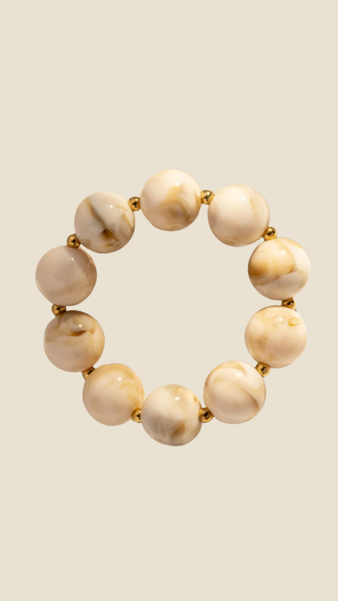 Ce bracelet élégant est composé de grandes perles rondes en résine effet marbre, séparées par de délicates perles dorées. Monté sur un fil élastique, il s’adapte confortablement à tous les poignets. Disponible en deux teintes chaleureuses — beige doux et ambre lumineux — il apporte une touche raffinée et naturelle à vos tenues. Parfait pour l’automne ou toute saison, ce bijou minimaliste séduit par son style intemporel et sa finition artisanale soignée.