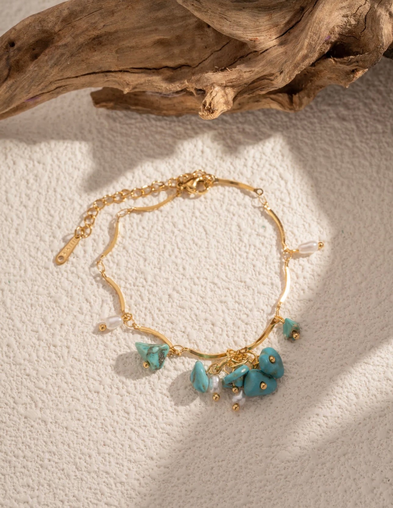 Ajoutez une touche de beauté naturelle à votre style avec notre Bracelet Natura - Turquoise . Fabriqué avec des pierres authentiques et orné de perles fines, ce bijou artisanal doré est réglable et peut être porté seul ou en accumulation pour un look bohème et élégant.