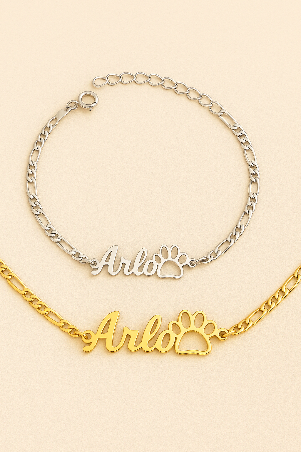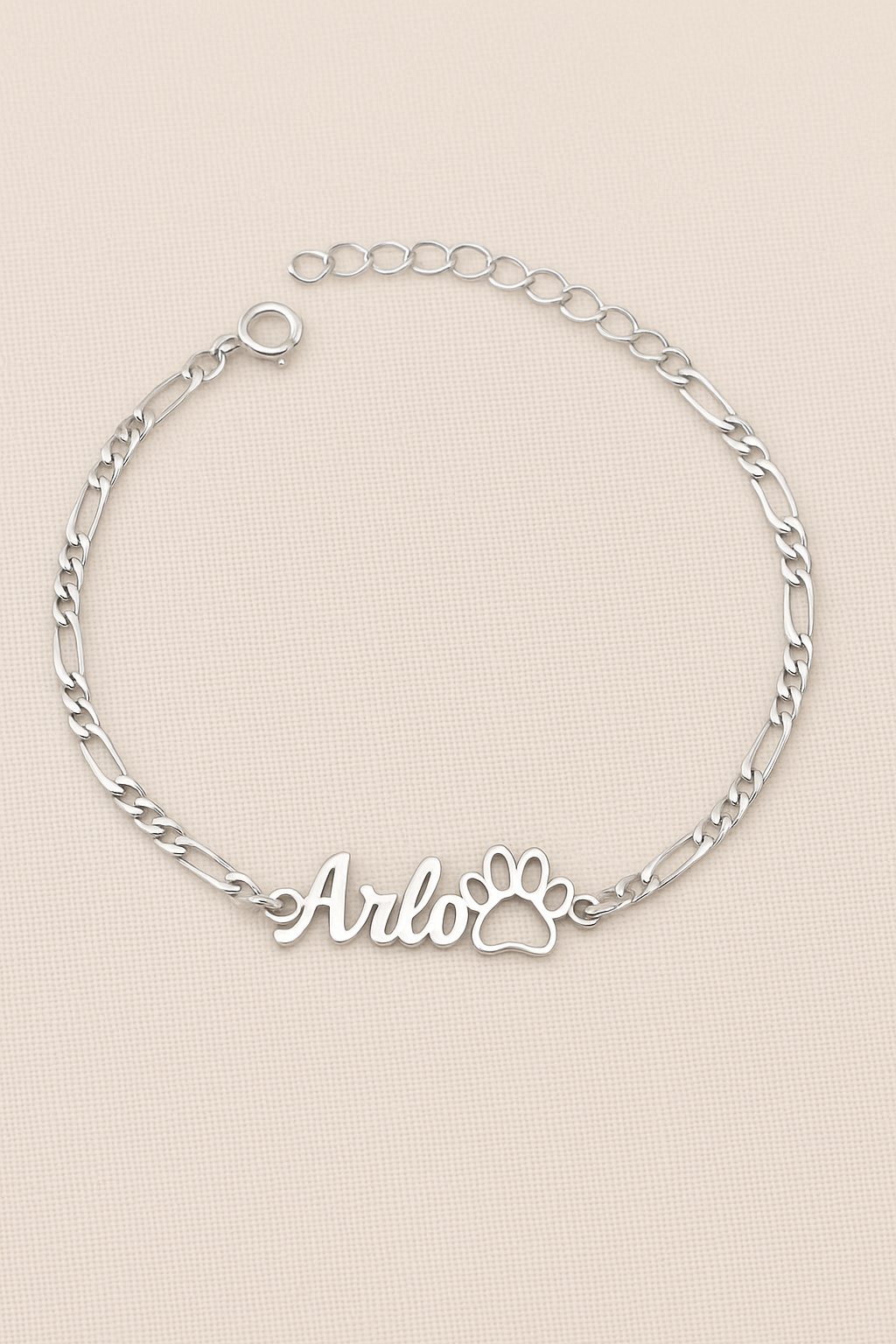 Ce bracelet en acier inoxydable est personnalisé avec le prénom de votre animal et orné d’une petite empreinte de patte, symbole d’amour et de complicité.