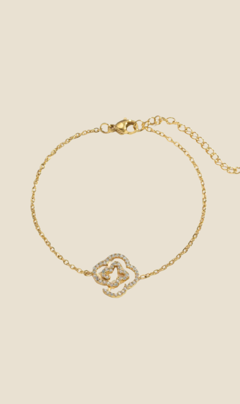 Sublimez votre look avec le Bracelet Tala - Doré . Finement en acier inoxydable doré avec un motif de trèfle orné de strass brillants, ce bracelet est à la fois élégant et porte-bonheur. Léger, résistant à l'eau et hypoallergénique, il est parfait pour un style raffiné en solo ou en accumulation.