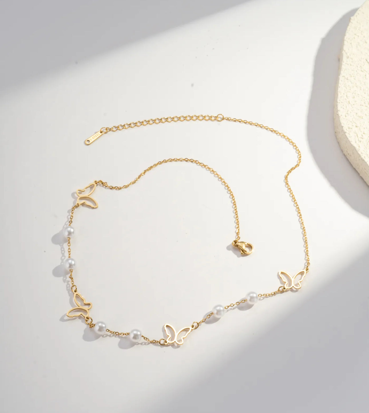 Ce collier doré est un mélange de perles délicates et d'un papillon léger qui évoque la beauté et la transformation. Le pendentif lumineux ajoute une touche de douceur à votre décolleté. Un bijou intemporel et poétique pour sublimer vos tenues avec élégance et fraîcheur.