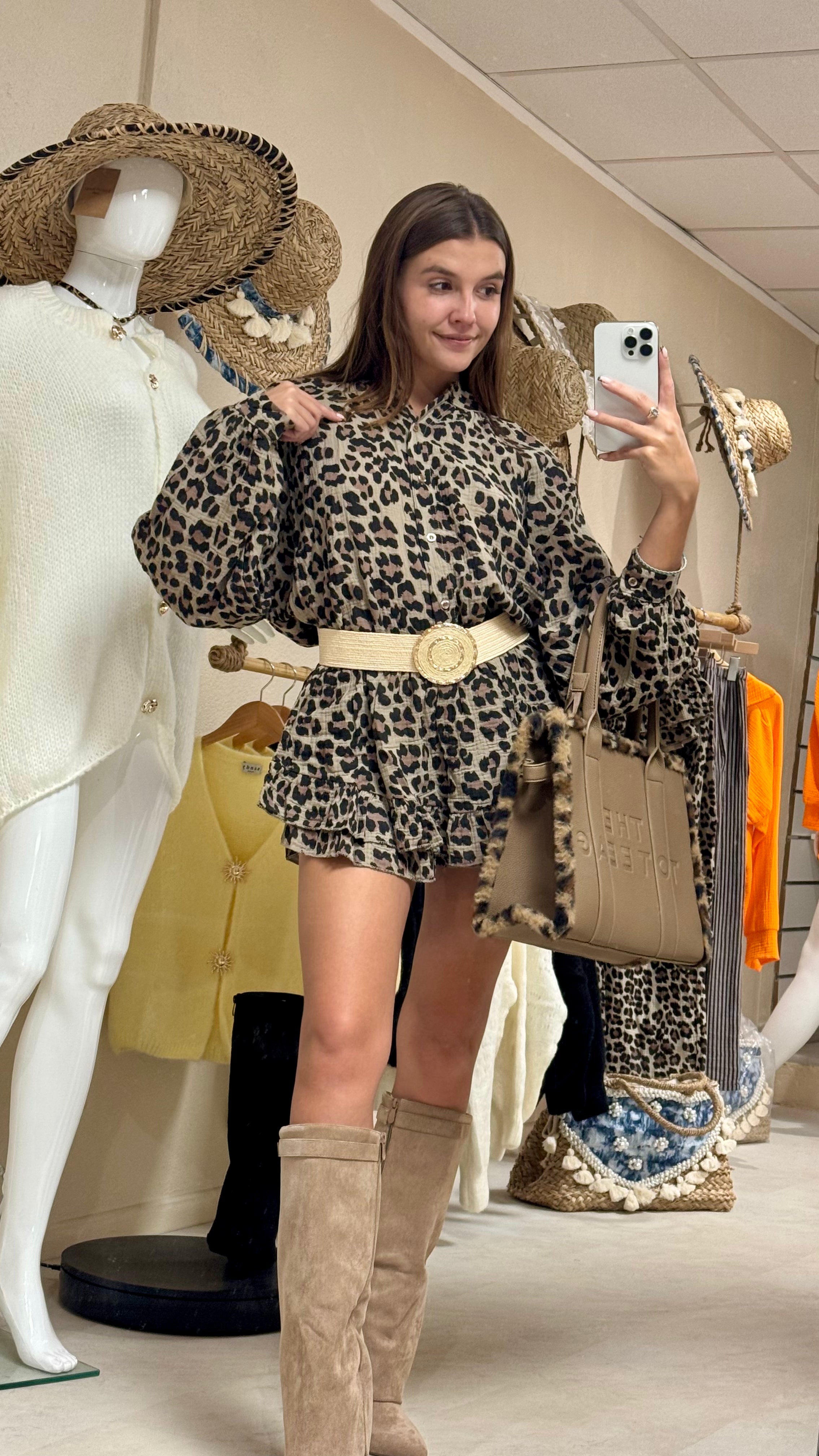 - Faites une déclaration de style sauvage avec l'Ensemble Léopard Sierra ! Fabriqué en coton gaze, cet ensemble audacieux et élégant comprend une chemise et une jupe-short pour une silhouette flatteuse. Son tissu léger et respirant vous offrira un confort absolu tout en vous donnant un look remarquable.