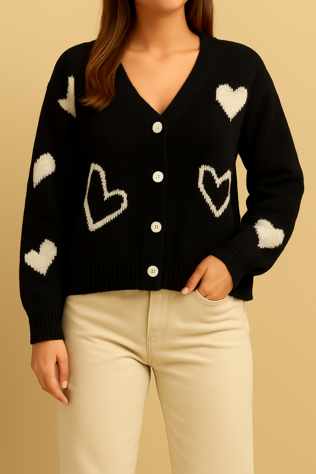 Apportez une touche de charme à votre tenue avec le gilet Isadora Noir. Son motif coeurs délicat et ses boutons élégants ajoutent une note romantique tout en offrant un confort agréable. Parfait pour sublimer vos looks quotidiens, il combine style et douceur pour vous accompagner avec aisance tout au long de la journée.