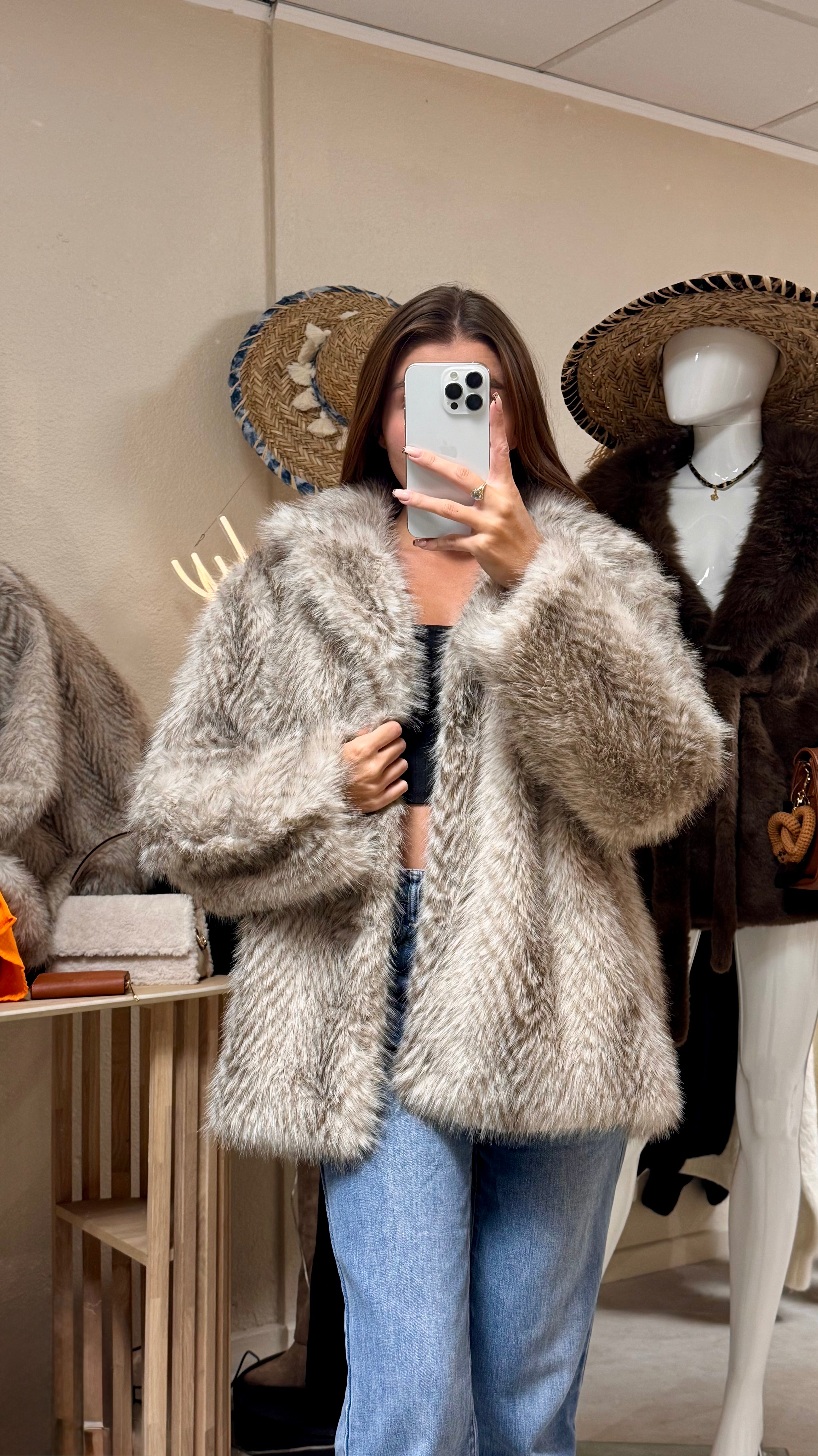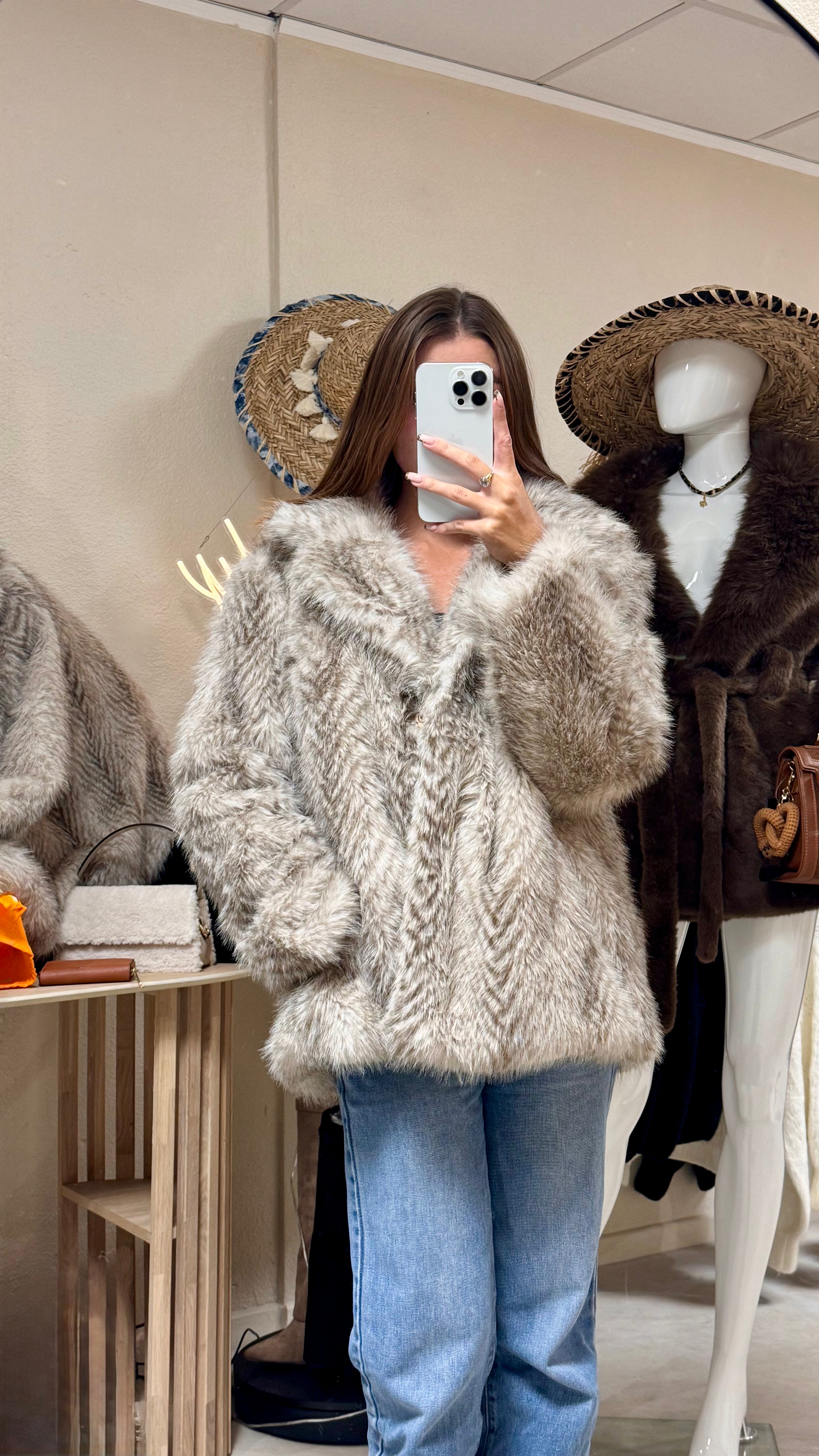 Donnez à vos tenues une touche de luxe avec ce manteau en fausse fourrure taupe. Son design délicat et ses nuances naturelles imitent parfaitement la fourrure véritable, ajoutant ainsi une touche de douceur et de confort à votre style. Un must-have pour allier élégance et style.