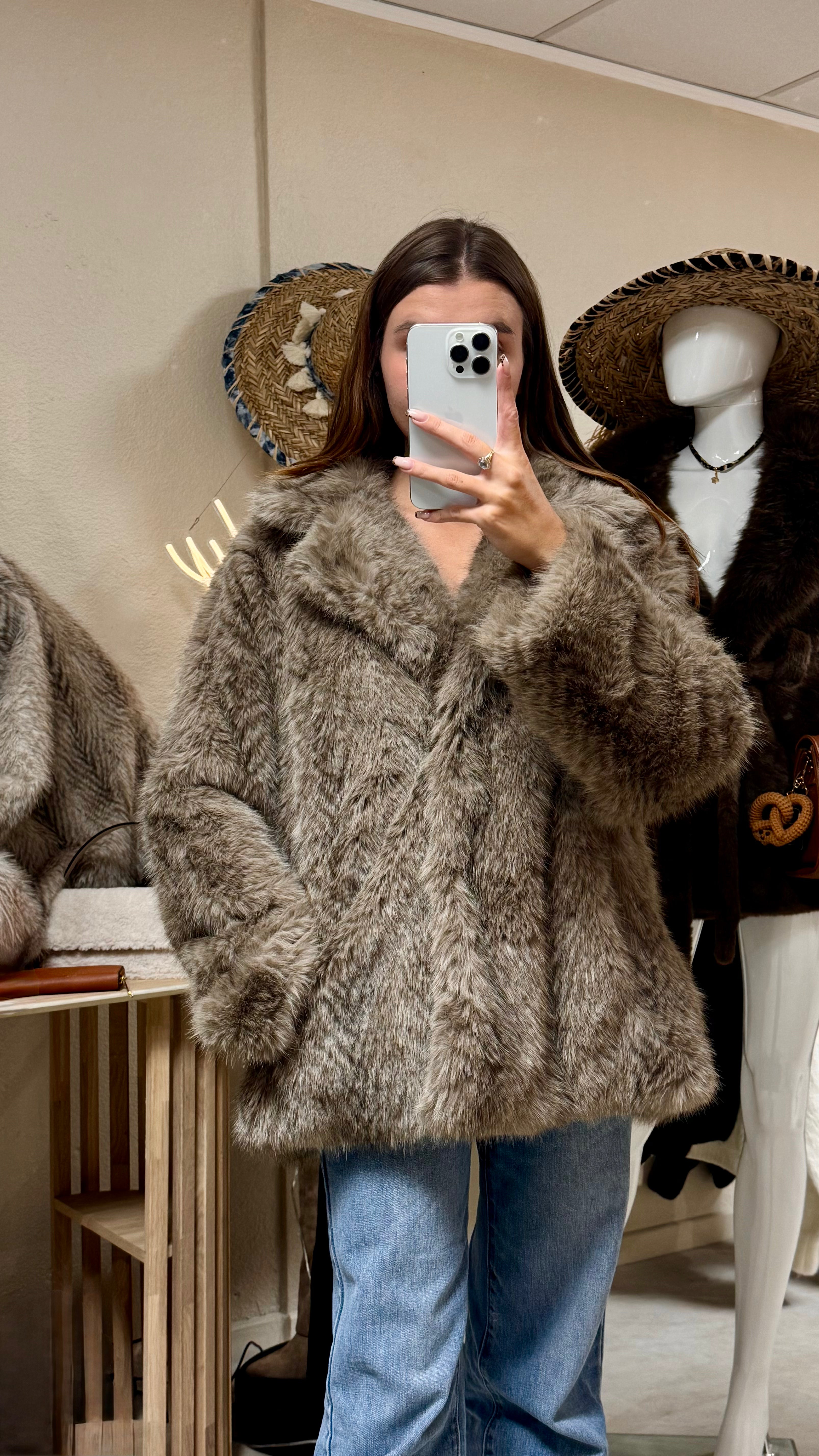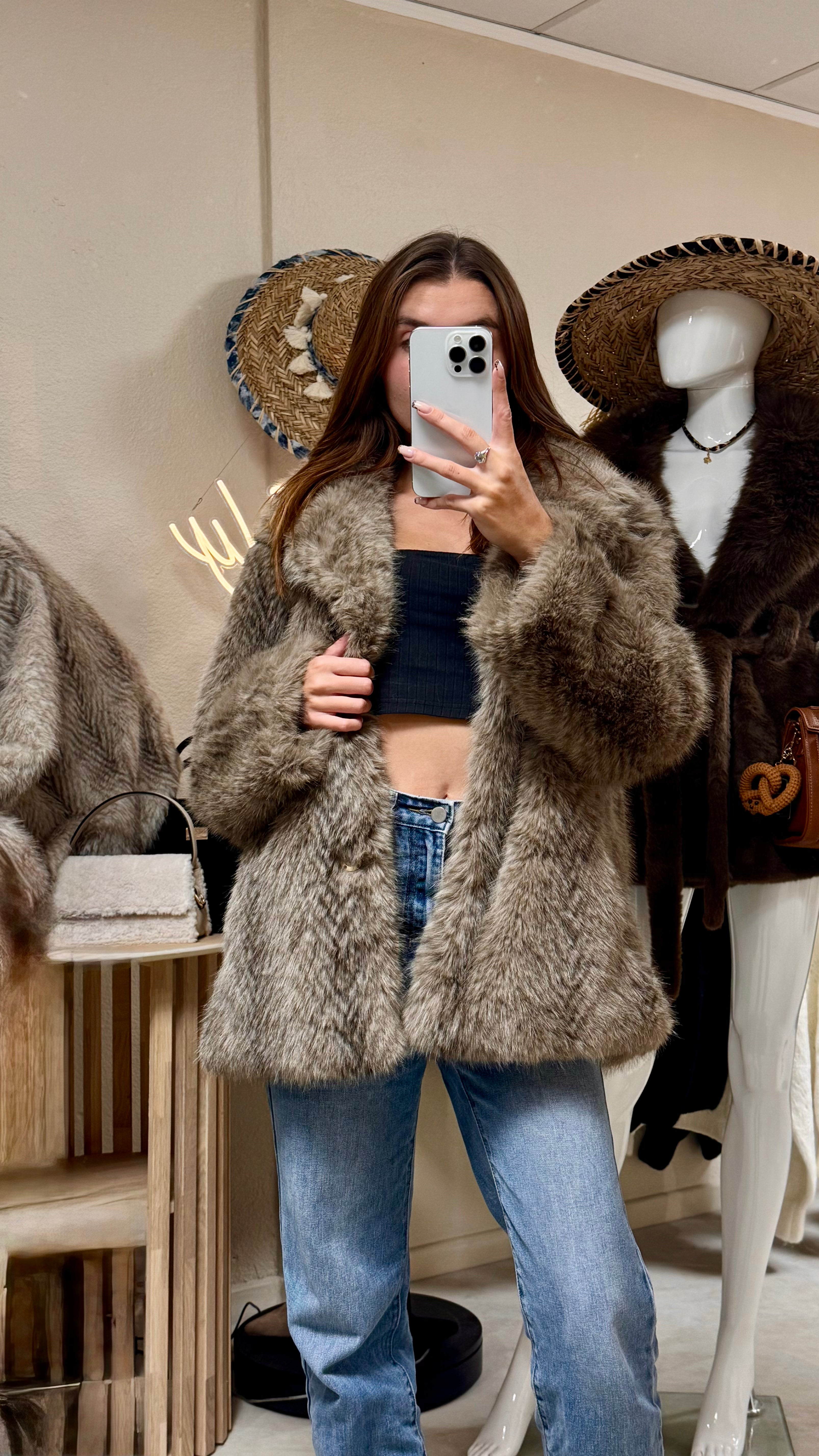 Donnez à vos tenues une touche de luxe avec ce manteau en fausse fourrure taupe. Son design délicat et ses nuances naturelles imitent parfaitement la fourrure véritable, ajoutant ainsi une touche de douceur et de confort à votre style. Un must-have pour allier élégance et style.