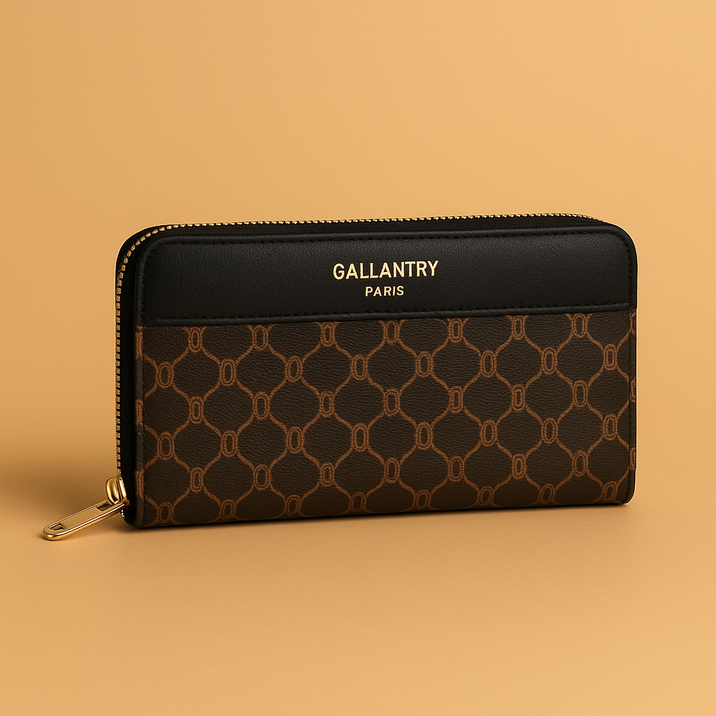 Doté d’une fermeture zippée dorée, il révèle un intérieur spacieux avec de multiples compartiments pour cartes, billets et une poche centrale zippée pour la monnaie.